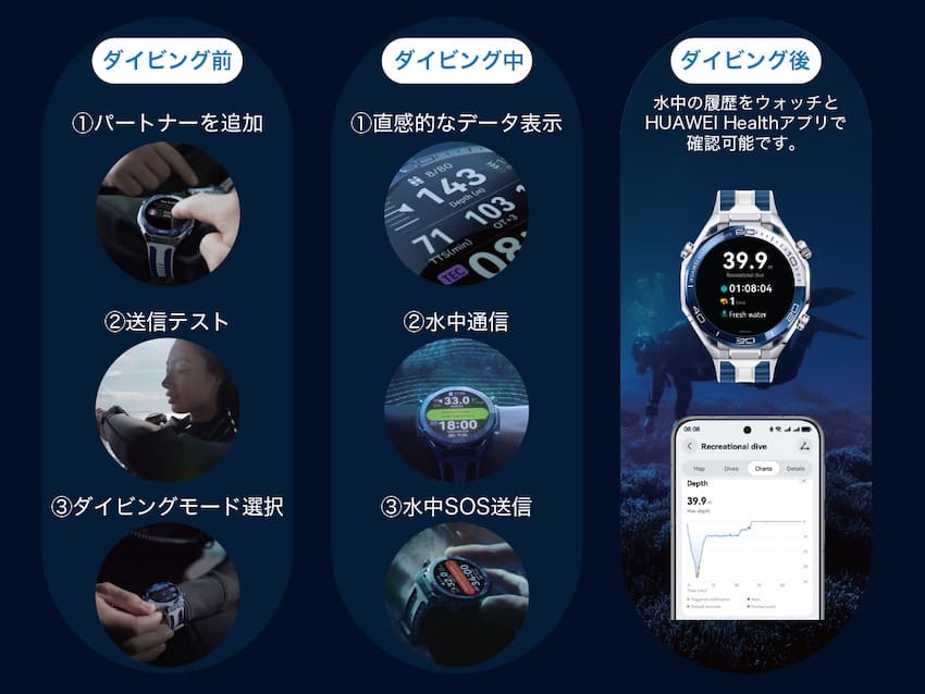 また、原選手は、水深150mまで設定できるアラーム機能にも注目。世界トップレベルのダイバーが挑戦するレンジまでカバーすることで、深度コントロールの目安として使えるとしている。実際、ファーウェイ・ジャパンは今年9月に鹿児島県東桜島沖で開催されたフリーダイビング国際大会「ボルケーノカップ2025」に協賛し、同大会では全選手が公式ウォッチとしてUltimate 2を着用した。100mクラスのダイブを支える計測ツールとして、競技シーンでの実績も積み上げている。