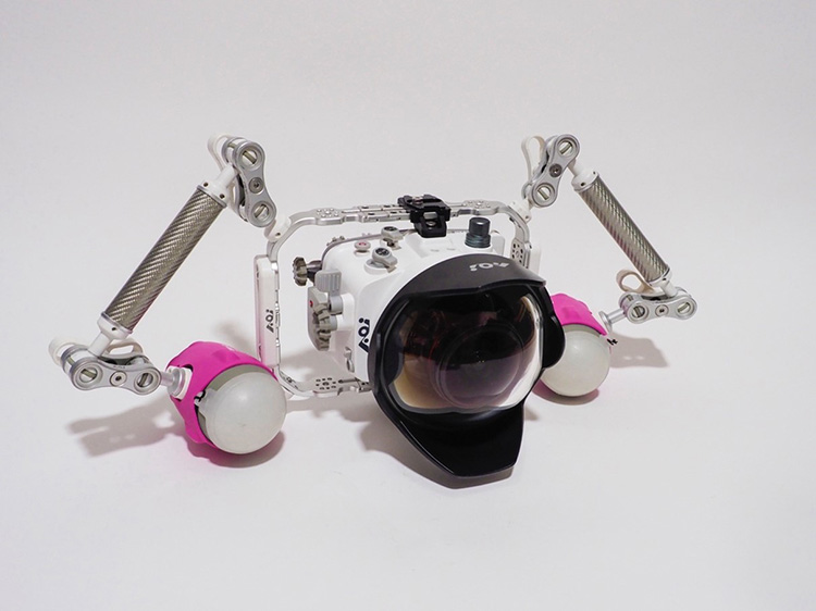 補助光はビデオLEDライト内蔵のAOI UCS-Q1iストロボを2灯使用。遠距離被写体にはストロボ光、暗い船内やムービー撮影時は内蔵LEDの常灯光で、1台で2役をこなす。水中撮影の操作性・機動性・光量のバランスを追求した現場目線のシステム構成だ。