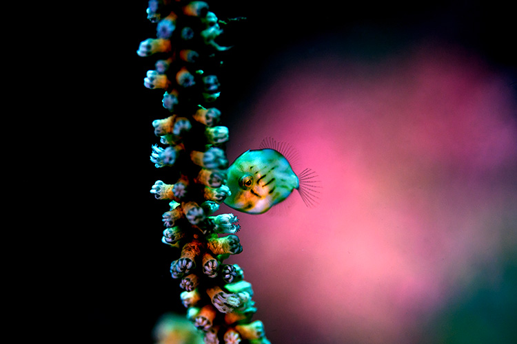 こちらの作品は左手に「S5」を持ちながら1灯でライティング、右手一本でハウジングを構えて撮影した写真です。一見逆光で当てているようですが、「S5」は強力なビームライトなので、背景のピンク色の岩肌に光が反射して、ピンクのバックライトを当てているような効果がでました。