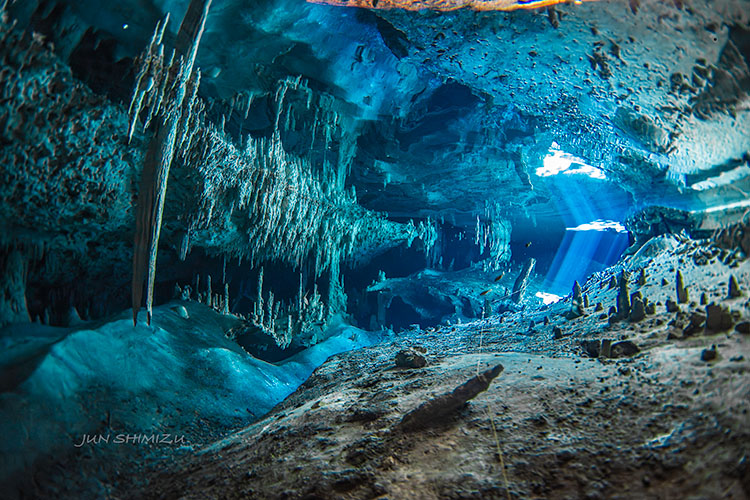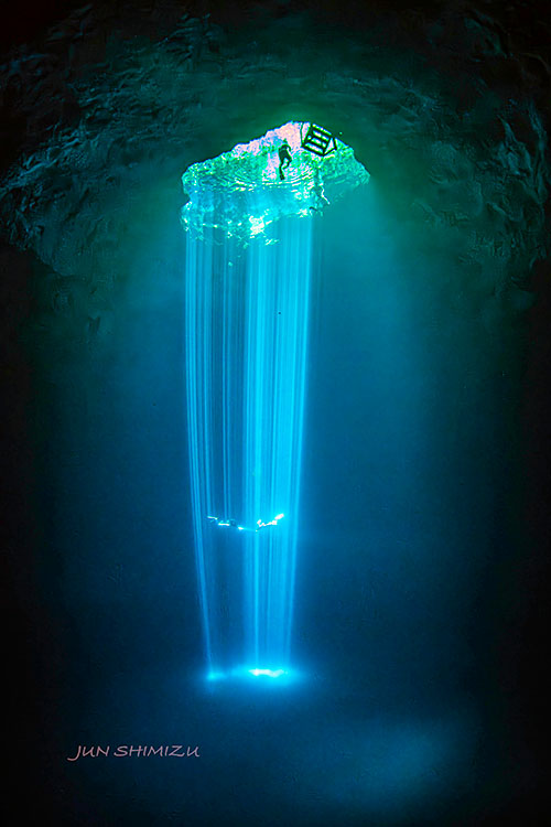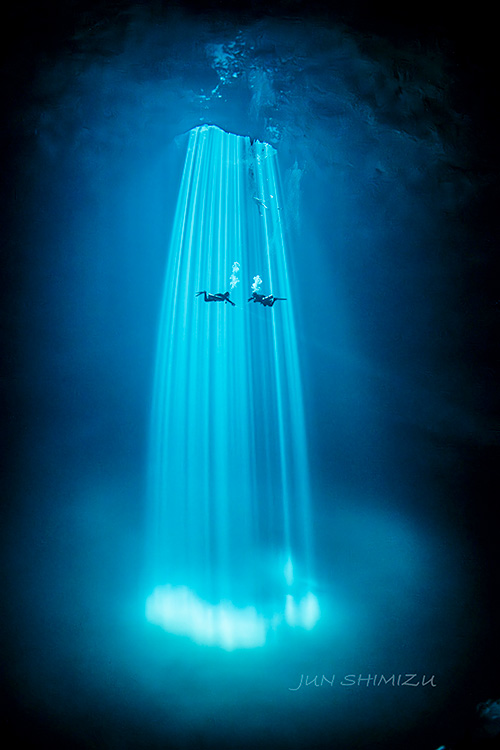 それでは作品を見ていただきましょう。まずは、カバーンエリア。その前に、カバーンエリアでの撮影の楽しみと撮影のコツを紹介したい。カバーンエリアの撮影は、「光を追う楽しさ」に尽きる。外光が差し込む限られた空間では、季節や時間帯で太陽の位置が変わり同じセノーテでも大きく趣が変わる。さらに雲の動きによって光の表情が刻々と変化する。数分違うだけでまったく別のシーンが立ち上がるのがカバーンの魅力だ。