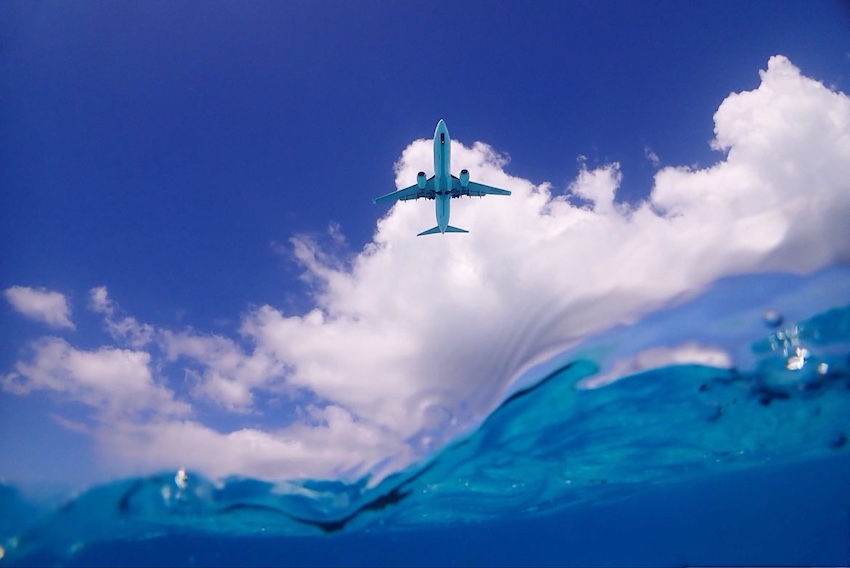 「潔いほどに水中世界の部分は捨て、水面をギリギリポートの下側に入れるようにして水中から撮影をしているという表現に落とし込んでいます。そうすることによって飛行機を真下から大きく捉えることができ、飛行機が強調されています。ああ、こうやって水面だけでも宮古島の青い美しい海を表現できるんだなと感心しました」