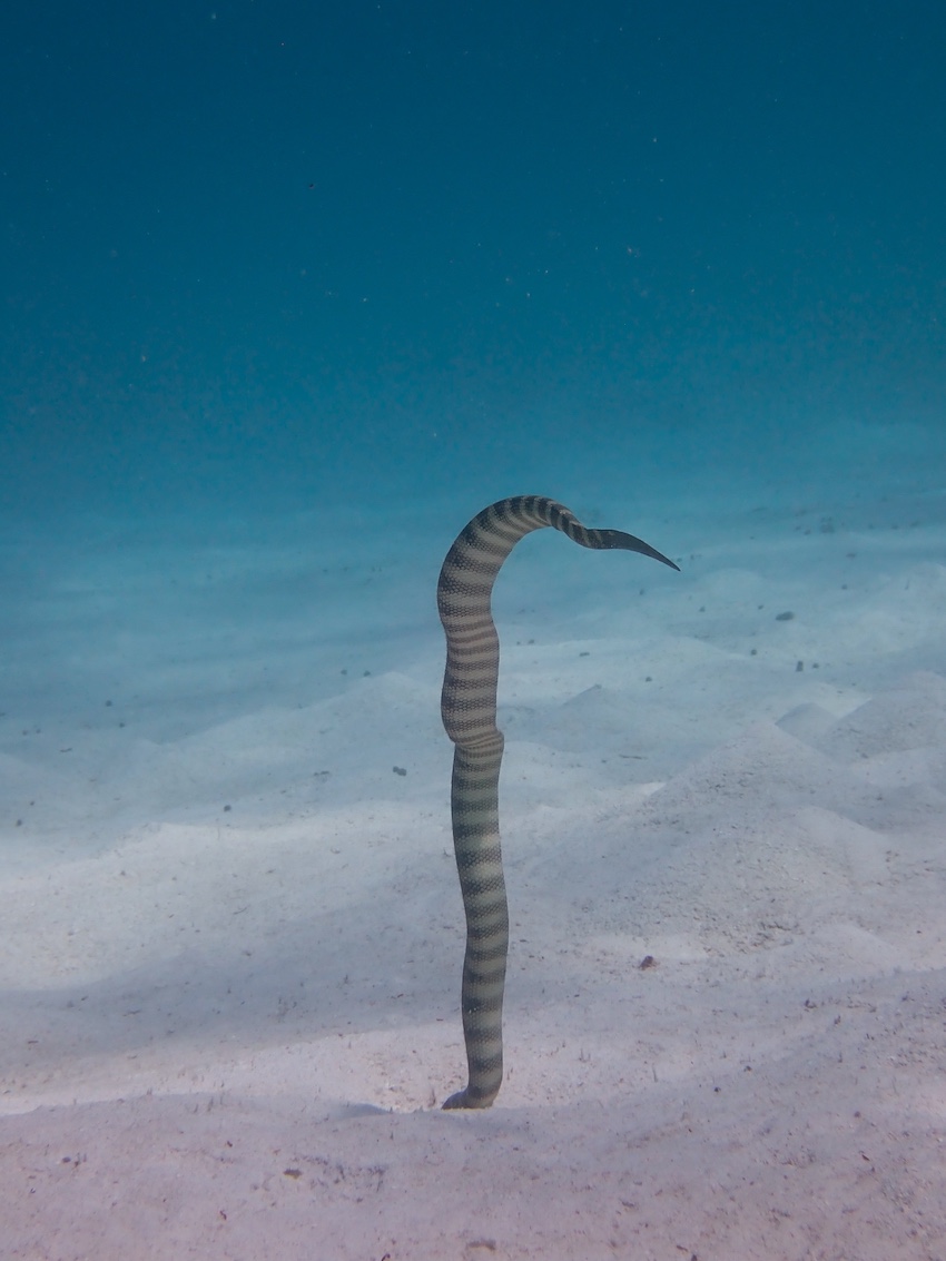 「潜っているとき、砂地からウミヘビが逆立ちしたまま静止しているのを見つけました。動く気配もなく、まるで海の時間が止まったようで、しばらく見とれていました。その不思議で少し可愛らしい姿を残したくてシャッターを切りました」