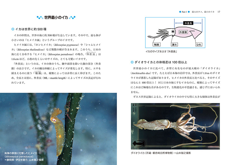 中でも目を引くのが、“人魚のモデル”といわれる深海魚「リュウグウノツカイ」との遭遇についてのトピック。伊豆半島沖で山本氏が撮影した稚魚の写真は、ミステリアスな美しさだ。ほかにも外套長(がいとうちょう)わずか1.6cmほどの世界最小の「ヒメイカ」の生態や新種発見情報なども興味深い内容となっている。