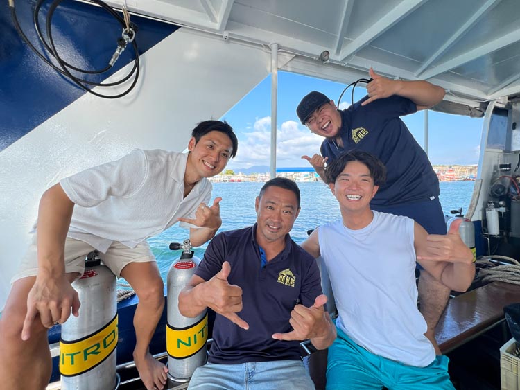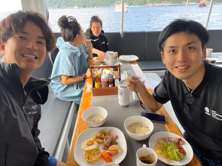 ここシミランでは1本1本のダイビングがまるで写真集の1ページのようでした。ダイバーにしか味わえない「特別な青」が待っているので早速紹介したいと思います。今回は、Big BlueさんのBlue Dolphin号に乗船し、ガイドの大村さんと神子元ハンマーズから研修に来ていた陽夏さんにお世話になりました。また、今回の旅のバディは鹿児島でフリーのインストラクターとして活躍する裕介さんです。