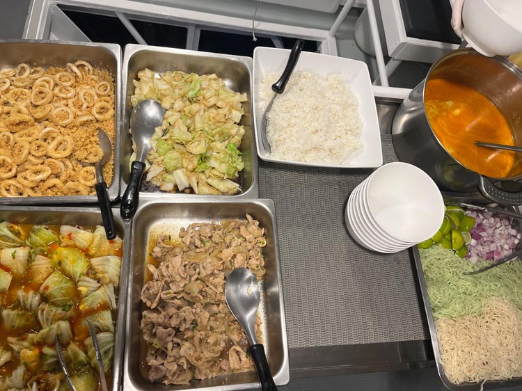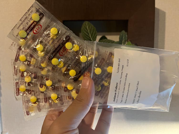 プーケットに到着した夜にBlue Dolphin号に乗船し、寝ている間にシミラン諸島へ移動してくれました。実は今回の旅日程、事前に風を見る限りポイントまでいけるか怪しいくらい荒れる予定だったのですが、揺れたのは初日の夜移動だけでした。机に置いてあったタンブラーが夜中に落ちたり、床に置いてあった荷物が滑ったりで眠りの浅い初夜とはなりましたが。船酔いする私は、タイの酔い止め薬をいただき、それを飲んで乗り越えました。船には常備されているのは、船酔いダイバーとしては安心、感動!