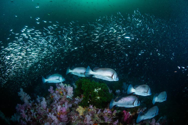 シミラン諸島はシーズンインしたばかりということで、小さくキラキラした命がたくさんお出迎えしてくれました。たくさんのスカシテンジクダイがソフトコーラルを覆い、そこを餌場とするハタがゆったり泳いでいる様子がとても穏やかな時間でした。シーズンとしてはだいぶ早期のタイミングで来てしまったので海の中はどうなんだろうか?と行く前に思っていたところはあったのですが、シーズンインらしい素敵な光景を見ることができました。