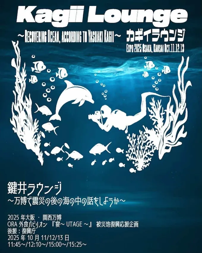 水中写真家・鍵井靖章氏が、現在開催中の大阪・関西万博、ORA外食パビリオン『宴~UTAGE~』にて、特別トークショー 「鍵井ラウンジ ~万博で震災の後の海の中の話をしようか~」 を行う。