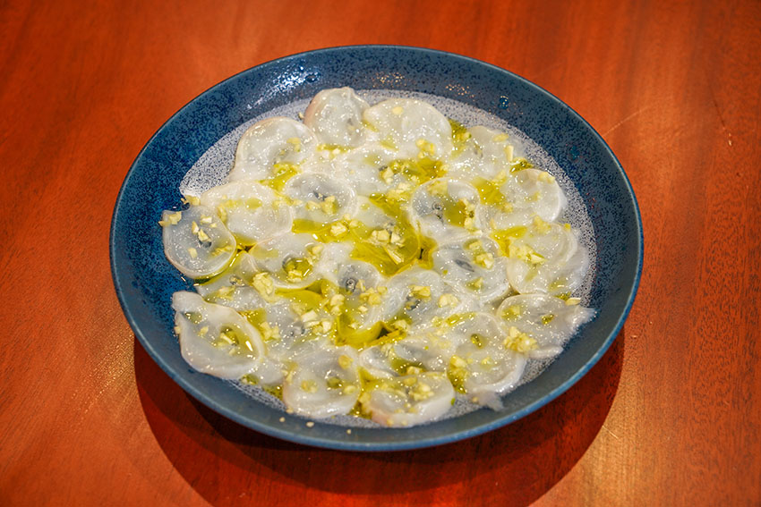 2日目の晩御飯は、西村さんの知り合いの古坂彰彦(以下、古坂)さんが料理をふるまってくれる魚料理店「OYAJI」へ。古坂さんは、元々ダイビングショップを経営していて、40年間潜っていた。以前は流氷ダイビングのガイドも行っていたそうで、ウトロの海のことは何でも知っている。今は、知床で漁師をしながら、地元の海鮮を使った料理が楽しめるこの店で調理を担当している。お店には料理メニューがなく、その日の水揚げ量や人数、予算によって献立が完成するというスタイルだ。