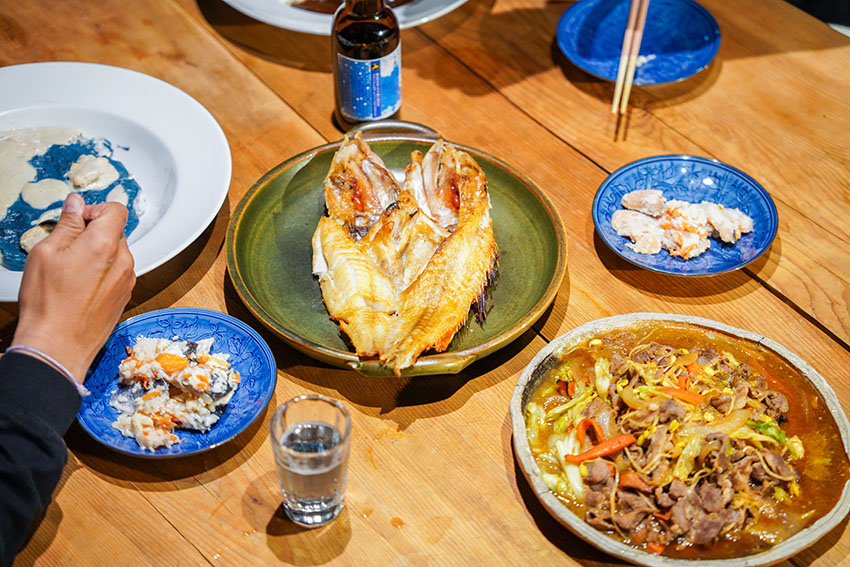 今回伺った際も、コース料理のような形で、鮭のちあいと腎臓、ミンククジラ、水たこ(やなぎたこ)、ブリのステーキ、サーモンとスライスオニオンのおつまみ、ブリのしゃぶしゃぶ、ちゃんちゃん焼き…と、次から次へと知床の海鮮を使った料理が提供された。古坂さんの手料理に合ったお酒と一緒に、知床の海の幸を堪能。現役漁師さんによる手料理が食べられるという贅沢な体験ができる。