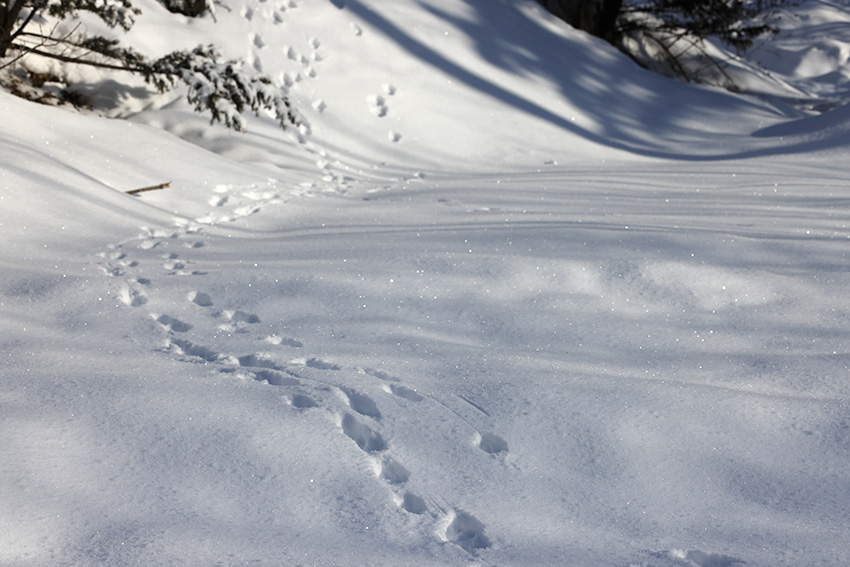 まずは森の中に入り、柔らかい雪を触ってみたり、葉っぱの上に器用に積もっている雪を見てみたり、雪に残る動物の足跡を少し追ってみたり、目の前の世界に夢中になりながら進んでいく。少しすると、フレペの滝に向かって一面雪の絨毯のようなひらけた世界が広がる。フレペの滝まであと少しだ。