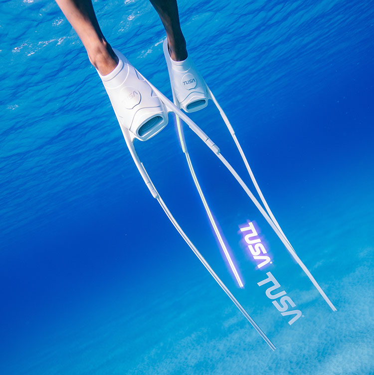 フィンの形状は洗練されたシルエットで、足元をすっきり見せてくれるデザイン。透明だけど光に当たるとオーロラのように輝いて、水中でとても映えます。そして、柔らかいけれど推進力があり、脚力に自信のない人でも扱いやすい。“遊べるフィン”という感じで、写真を撮る人にもおすすめです。